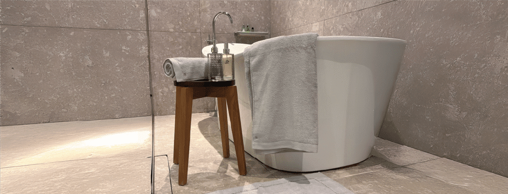 Toalhas macias e absorventes feitas de algodão penteado, elevam a experiência sensorial do banho. Roupões confortáveis prolongam essa sensação de aconchego, criando uma transição suave entre o banho e o descanso.